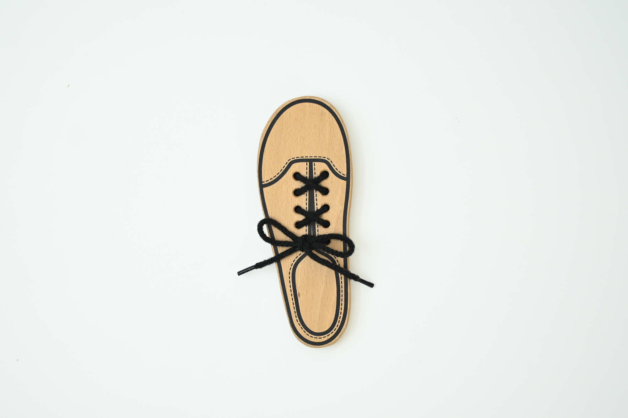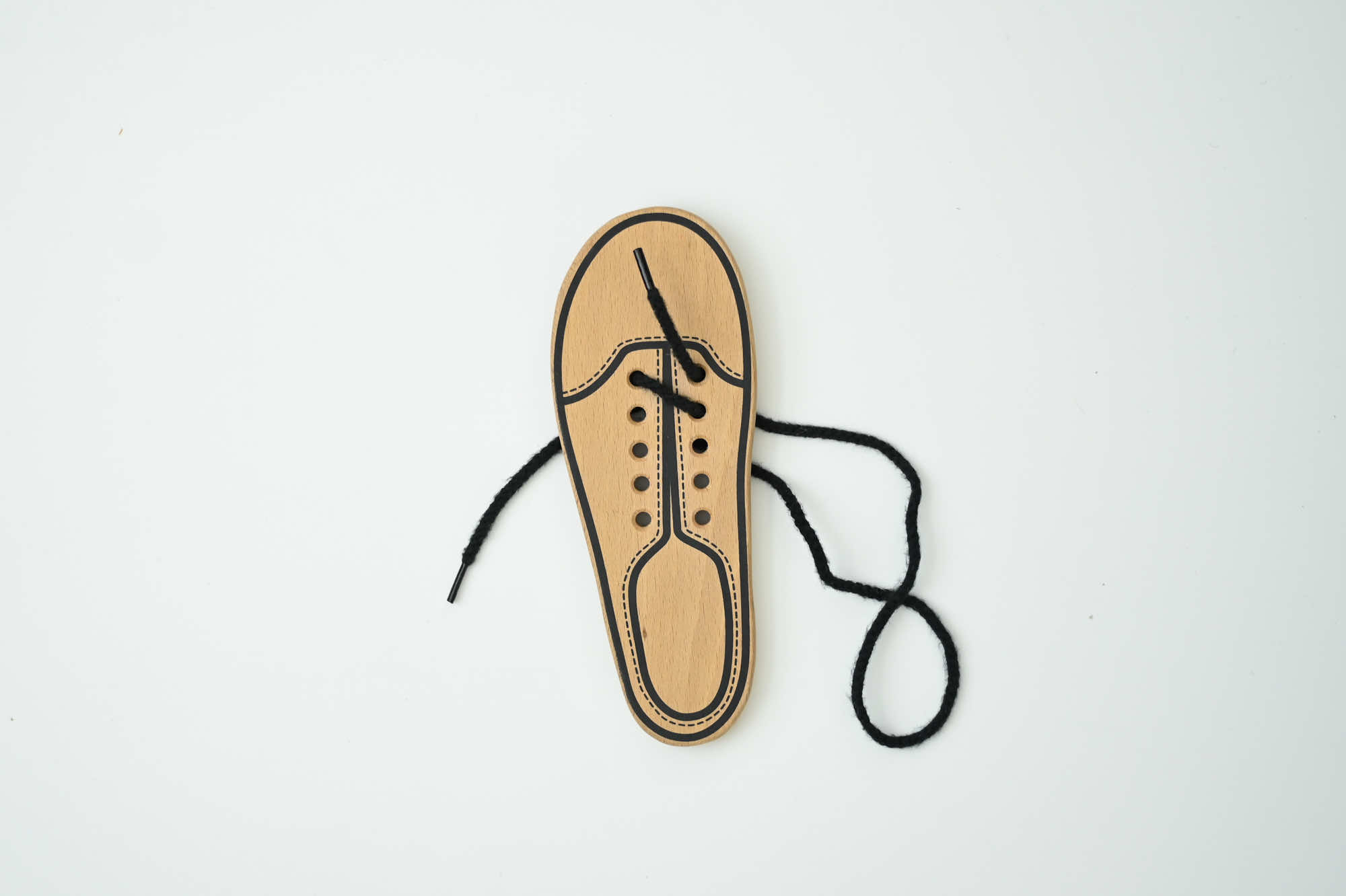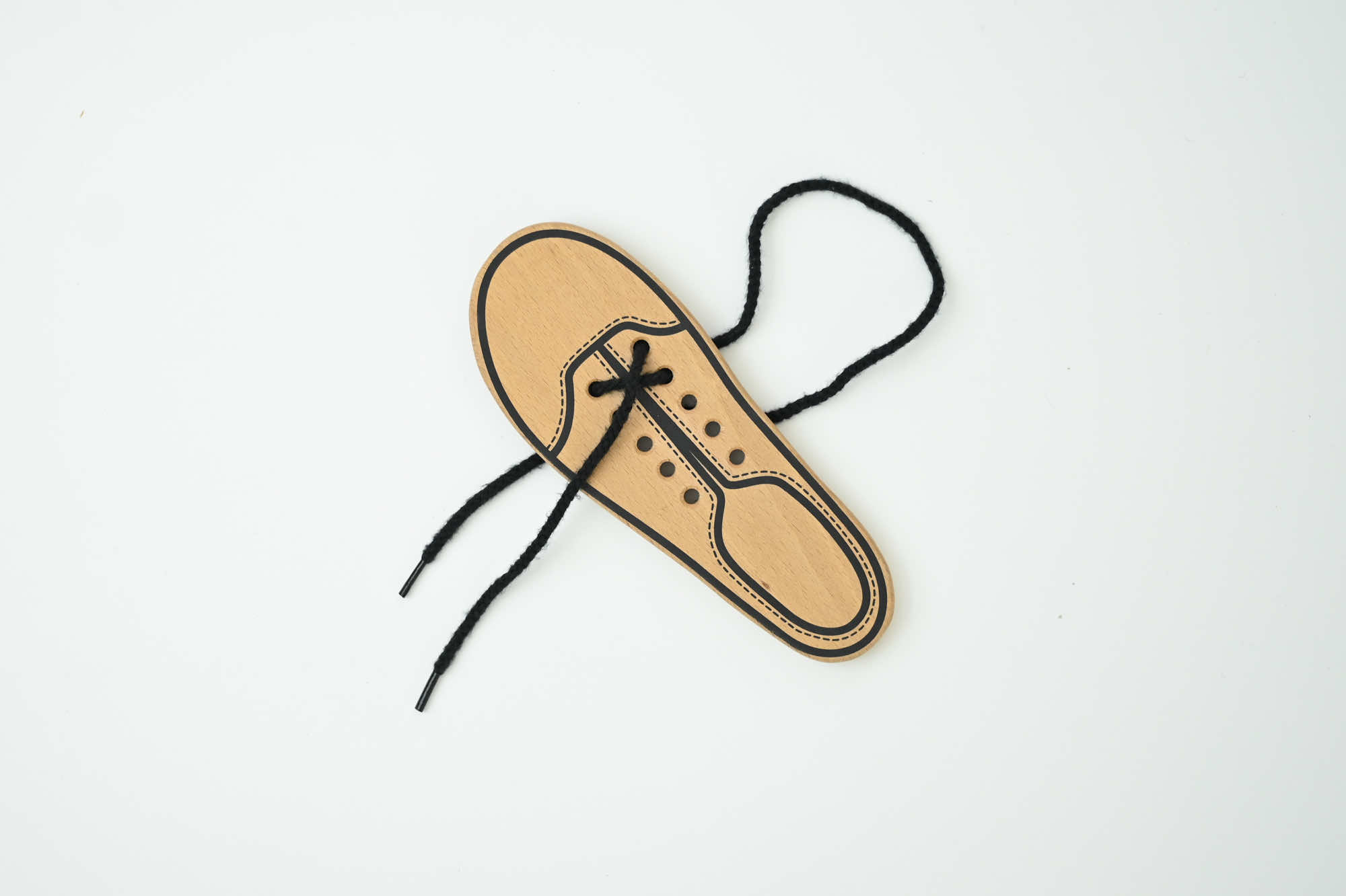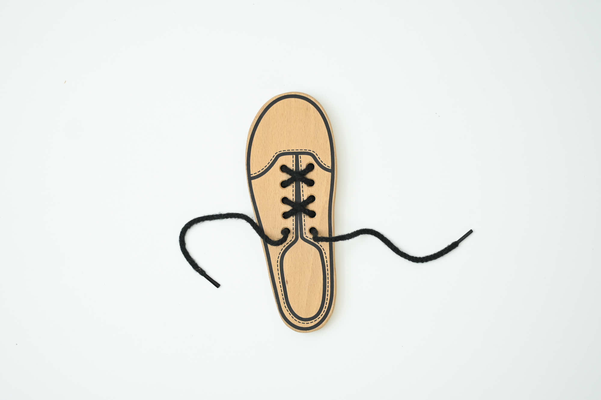 靴紐を通す練習ができる玩具です。紐の通し方は何通りかあるので、お子さまの想像に任せ、自由な発送で遊んでいただけます。