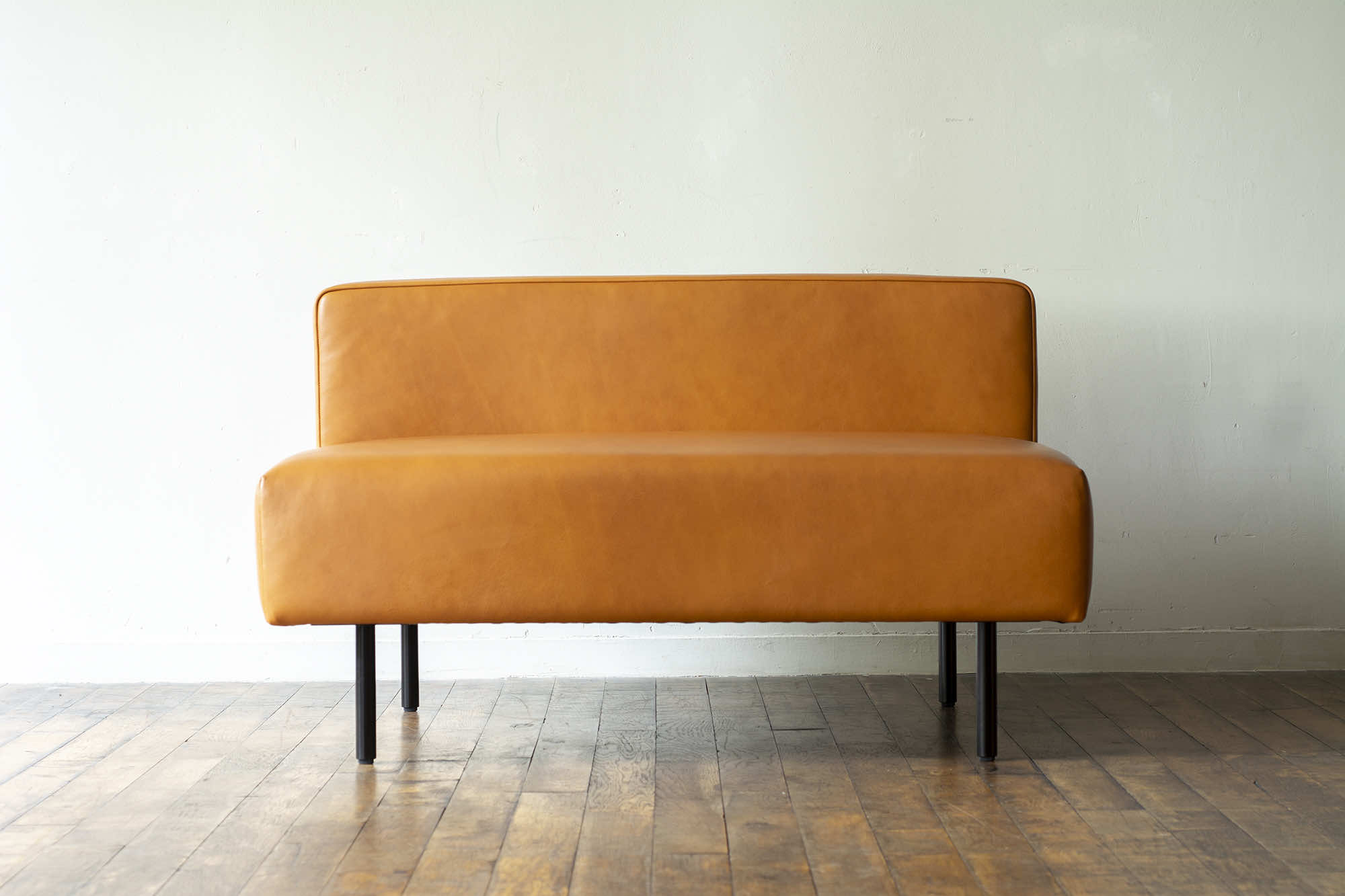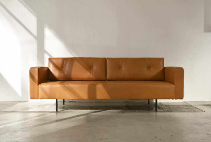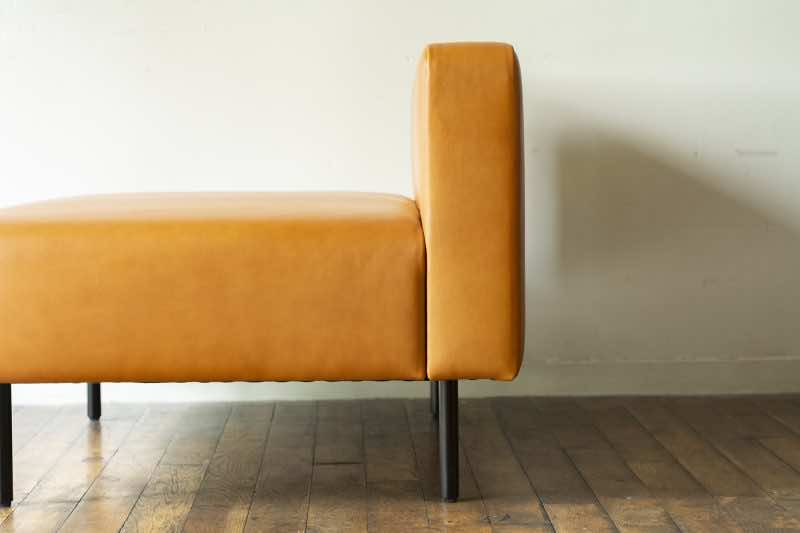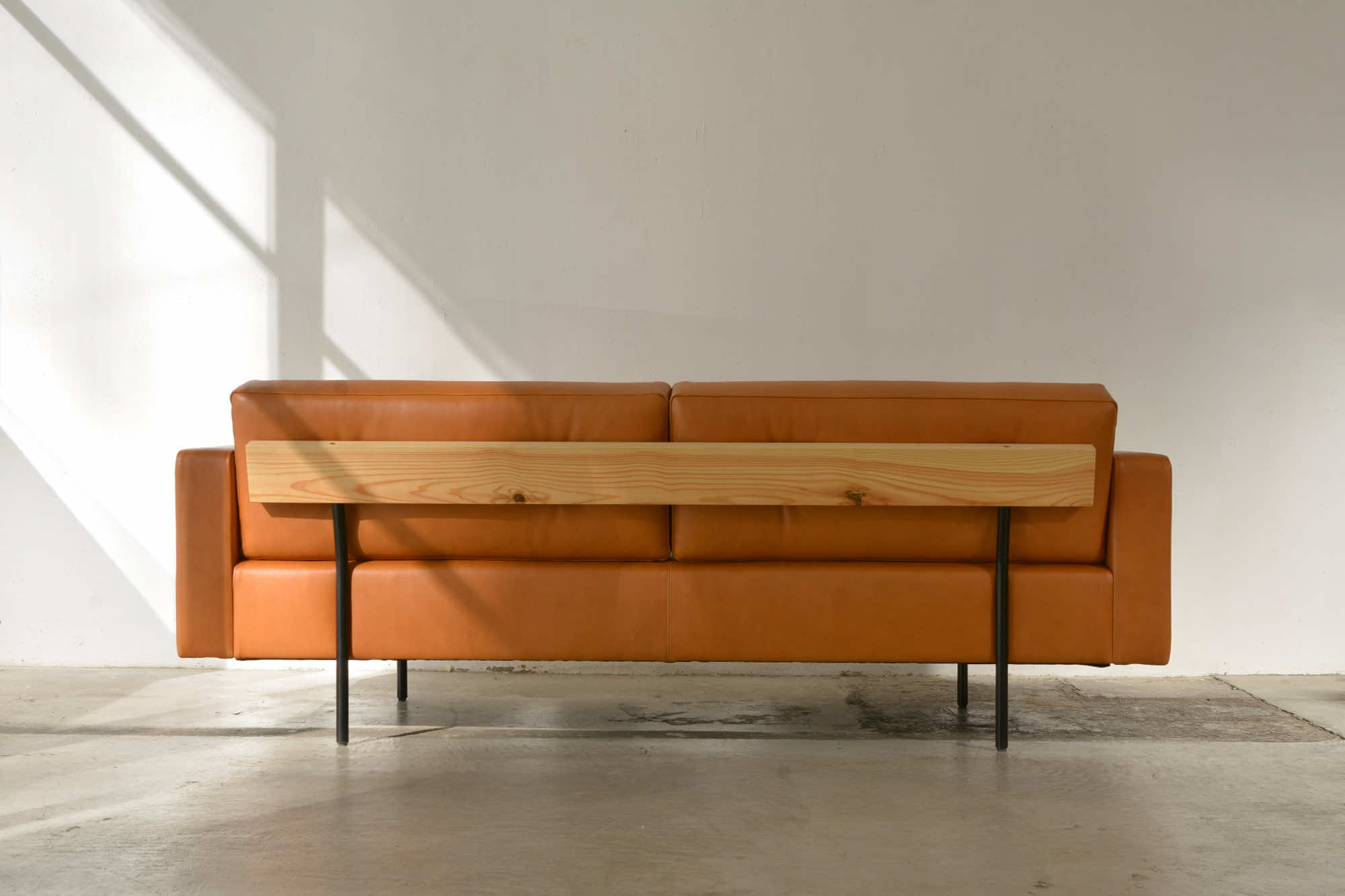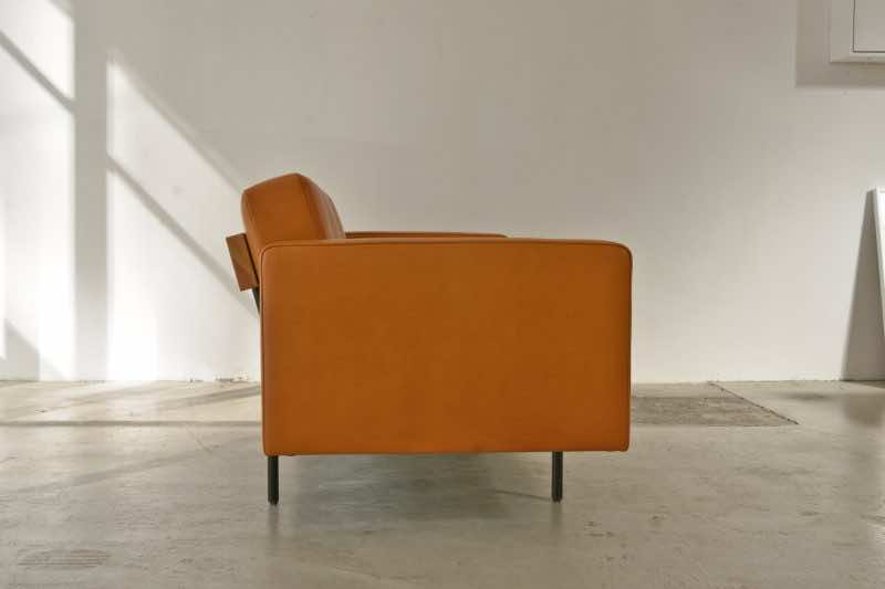 ソファ本体はアームを含めると全長2メートルを超えるボリューム感がありますが、細い脚を内側に配置することで、軽やかで浮遊感のある印象に仕上げています。