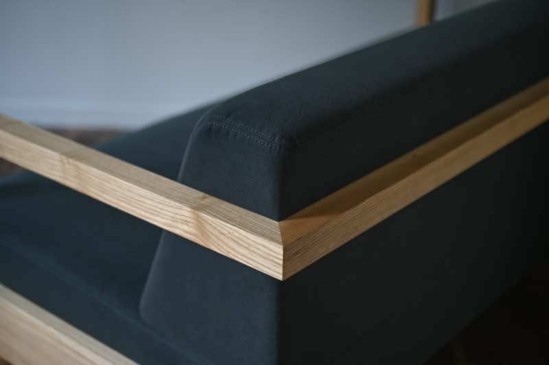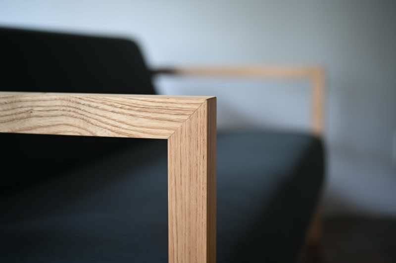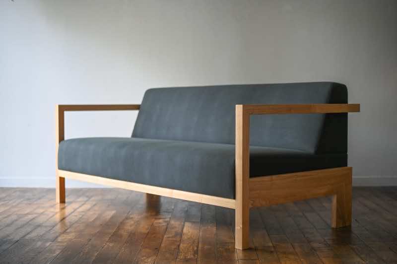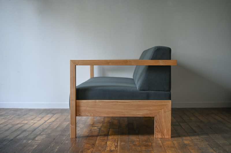 デザインの主軸となるのは、装飾性を極限まで排したミニマルなアーム部にあります。前脚には、テーブル脚にも用いられる角材を採用し、床から垂直に立ち上がって背もたれを囲む構成とすることで、構造的な強度と視覚的なリズムを両立。