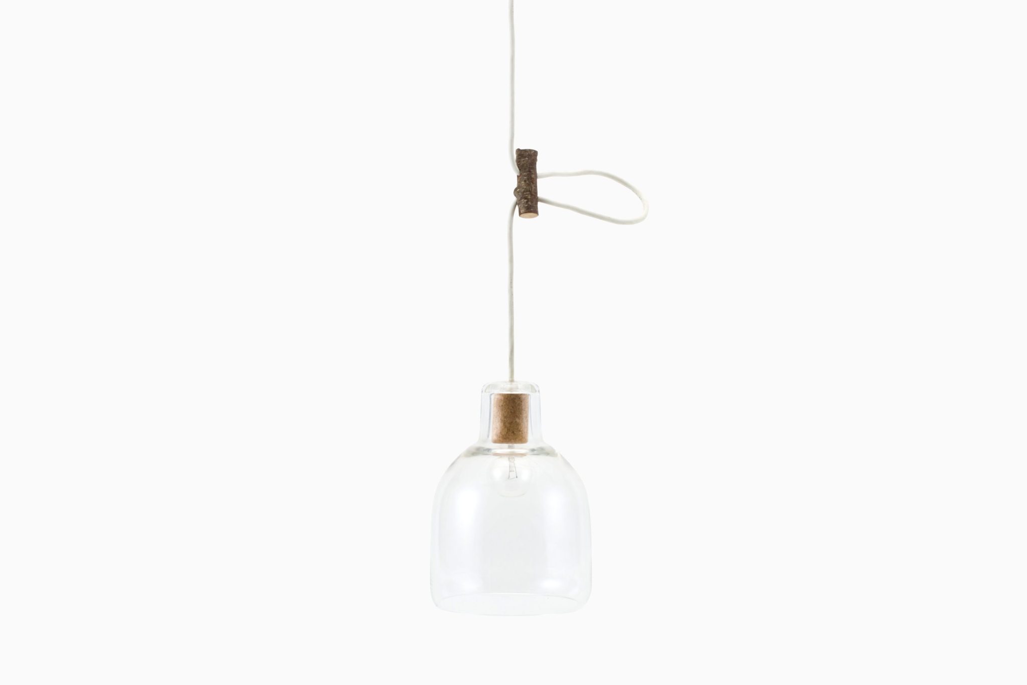 「Bottle Lamp」と名付けられた照明は、裾がわずかにすぼまったフォルムや、ボトルの蓋を思わせるコルク製のブラケットカバーなど、ガラスボトルを彷彿とさせるディテールが特徴です。