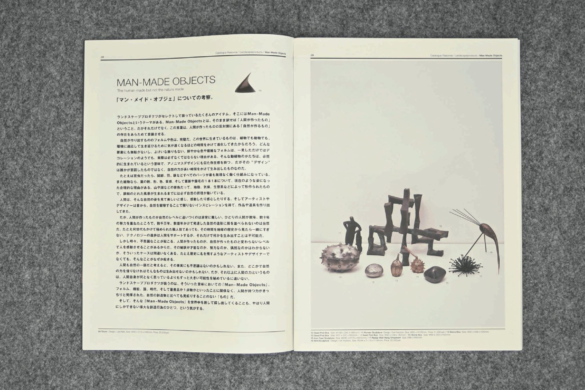 ランドスケーププロダクツのオリジナル家具、プレイマウンテンにて当時セレクトした雑貨、また「Man Made Objects」をコンセプトに構成されたアイテム等を掲載。